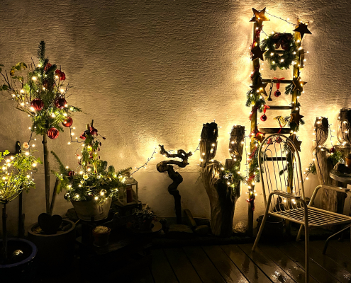 Wir schmücken unseren Hof mit vielen Lichtern und am Abend, wenn es dunkel ist, lassen wir uns ganz vom Lichterglanz verzaubern: